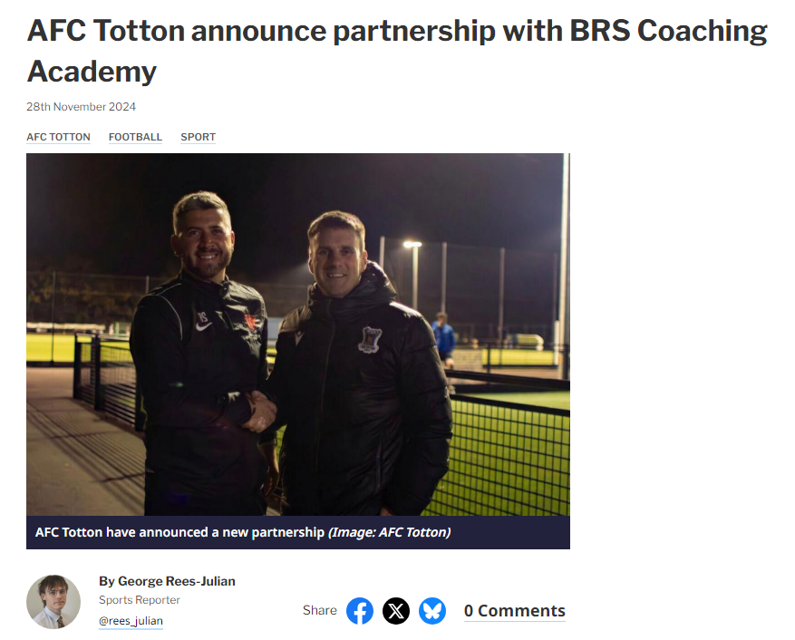 In late November, AFC Totton announced a partnership with the BRS Coaching Academy in Chapel Gate, Bournemouth.